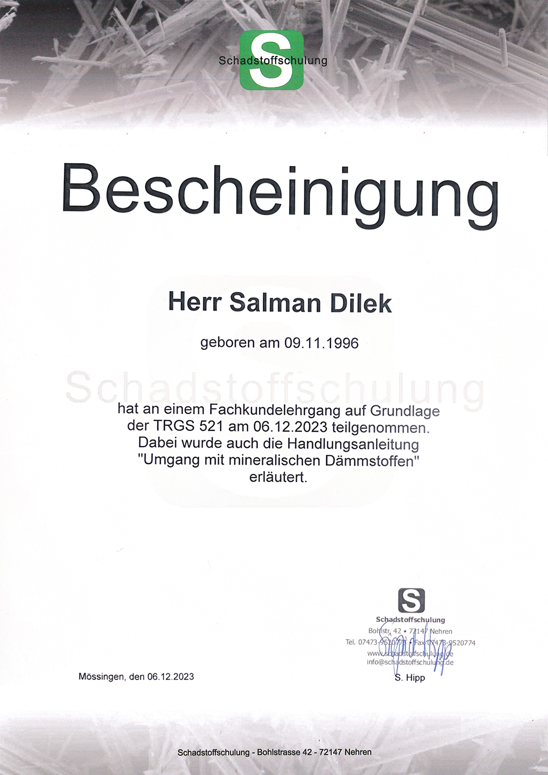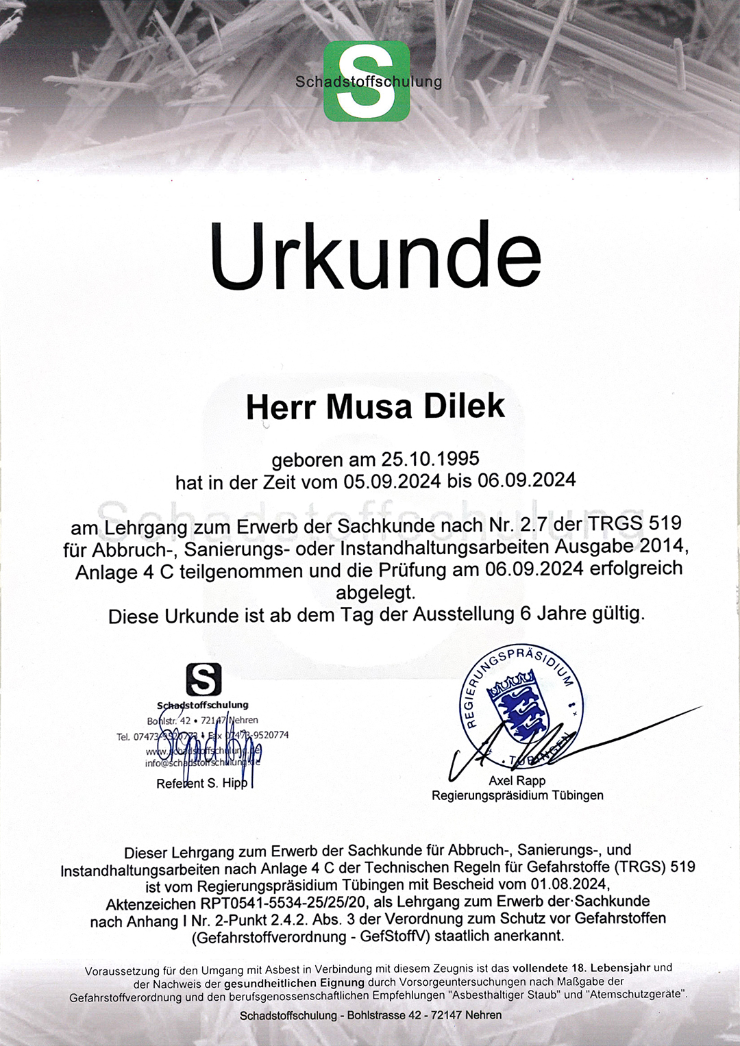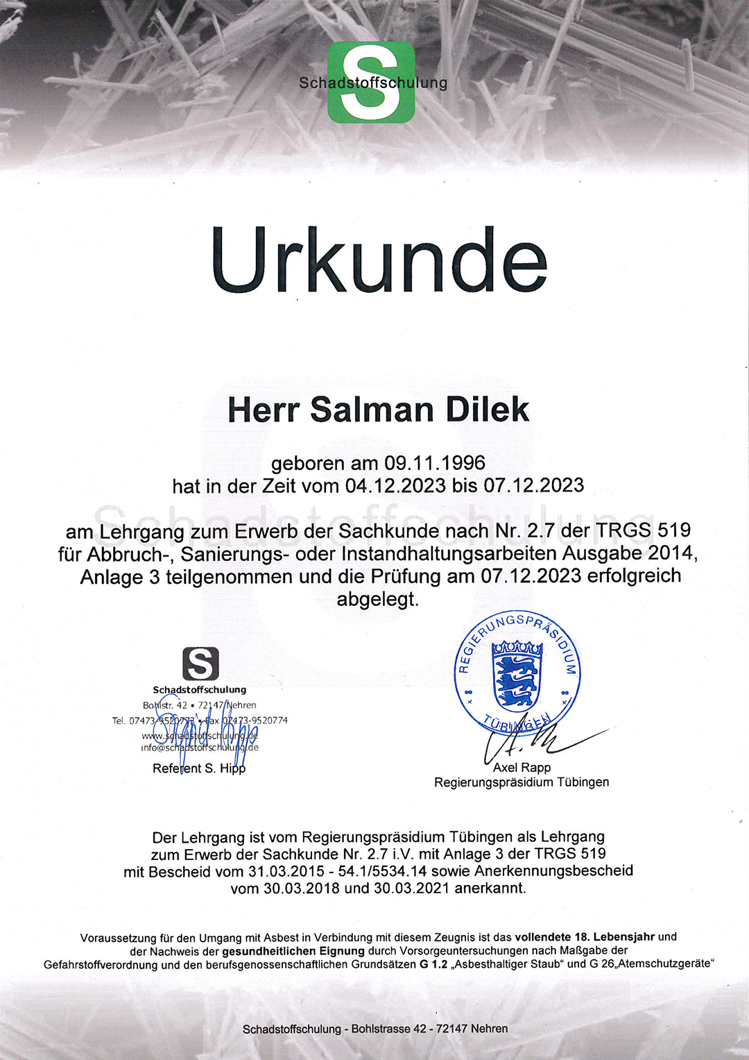 Mit den Zertifizierungen bzw. Sachkundenachweisen unseres Unternehmens und deren Führungskräfte stellen wir sicher und garantieren wir von DSH-GmbH Qualität, Effizienz und Zuverlässigkeit. Wir sind uns bewusst, dass wir eine hohe Verantwortung für unsere Mitarbeiter, die Umwelt und die nachfolgenden Gewerke tragen. Dies gilt im Besonderen im Bereich der Asbestsanierung.